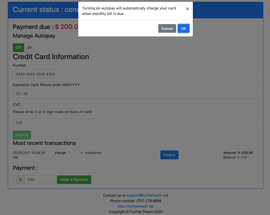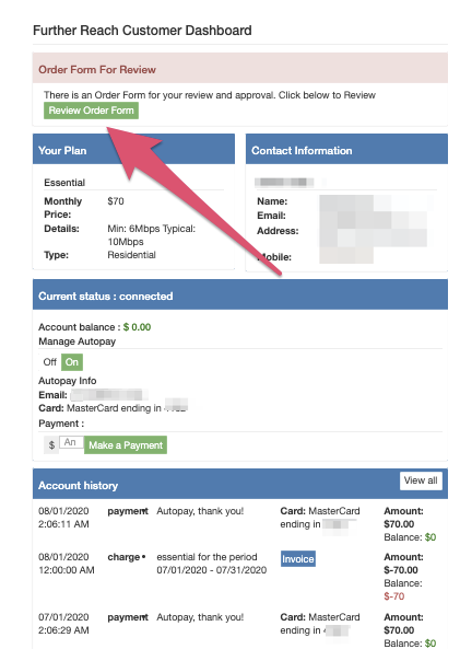 For more information on your billing portal, please see this page: https://www.notion.so/furtherreach/Subscriber-Portal-Your-Online-Account-363e7dc308ee47bd91afa7b4c6ec4793