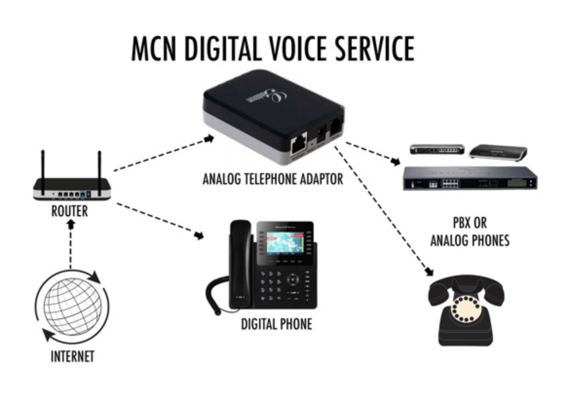 Ooma is a DIY option that is a few dollars cheaper and only provides limited support by phone. Ooma requires more technical capability than MCN Digital Voice (see setup instructions below).